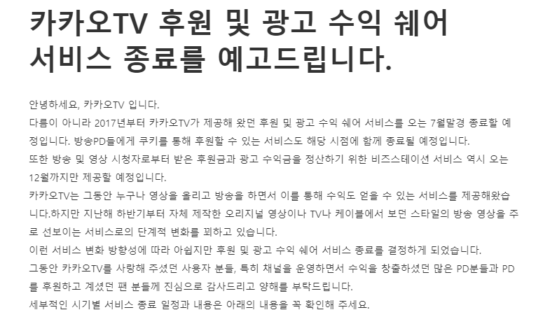 그러다 결국 오늘 카카오tv 광고수익, 후원 서비스 종료한다고 공지뜸